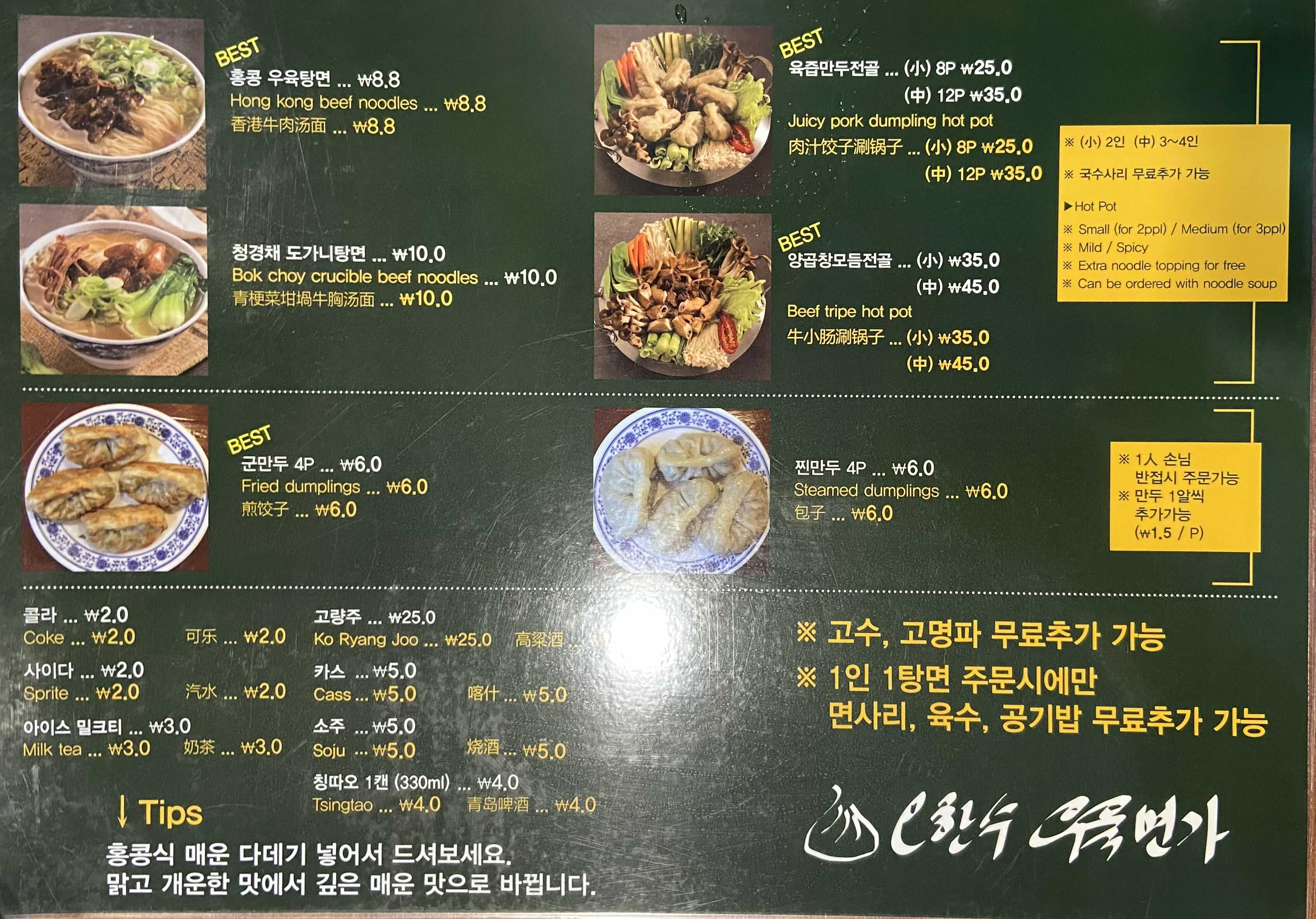 홍콩식 우육탕면과 튀김만두를 잘 하는 오한수 우육면가 였다.