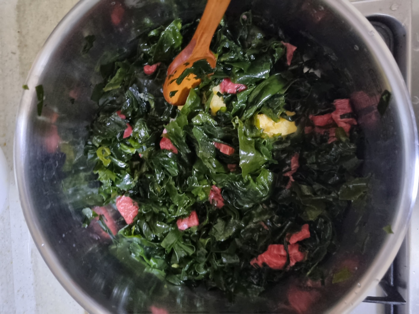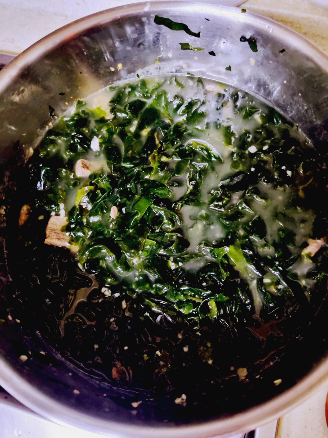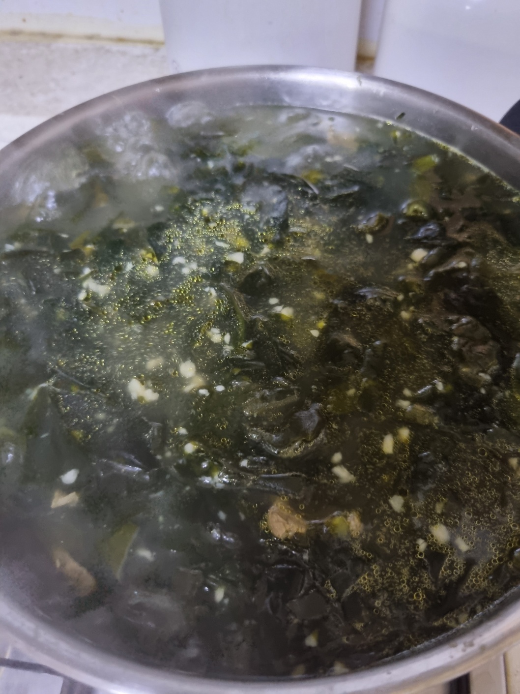 6. 미역국이 한번 끓으면, 물을 한 차례 더 넣고 강불로 한소끔 끓여요~