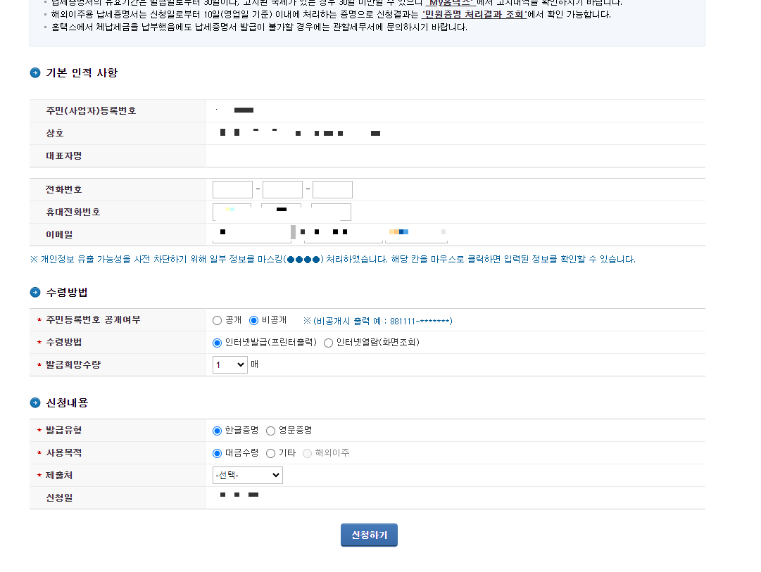 '국세증명, 사업자등록 세금관련 신청/신고'를 누른 후