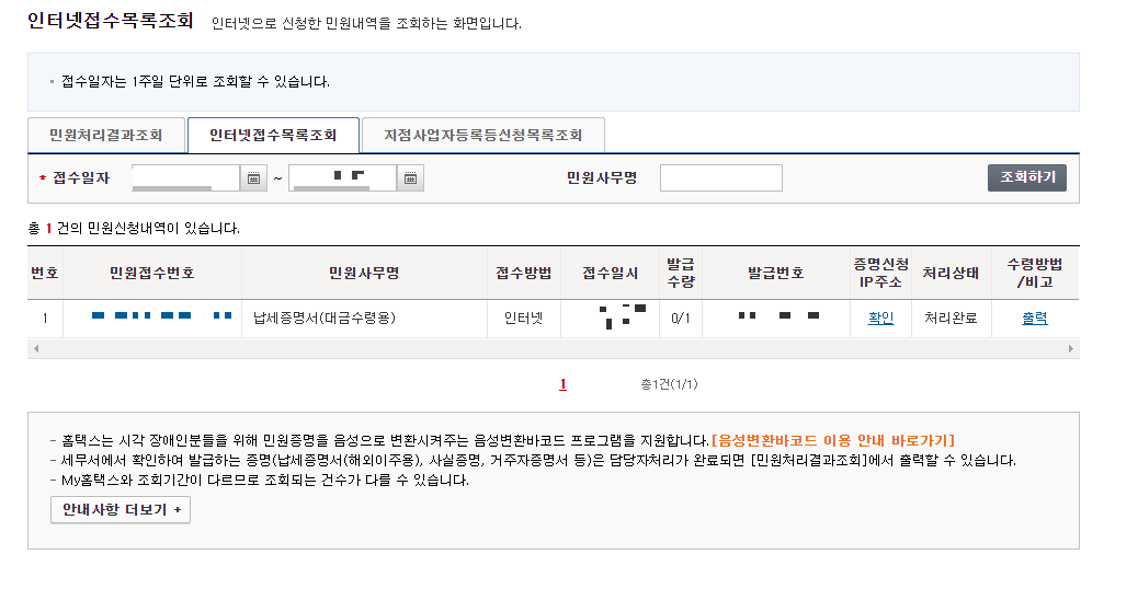 5. '신청하기'를 누르면 인터넷접수목록조회가 뜹니다.