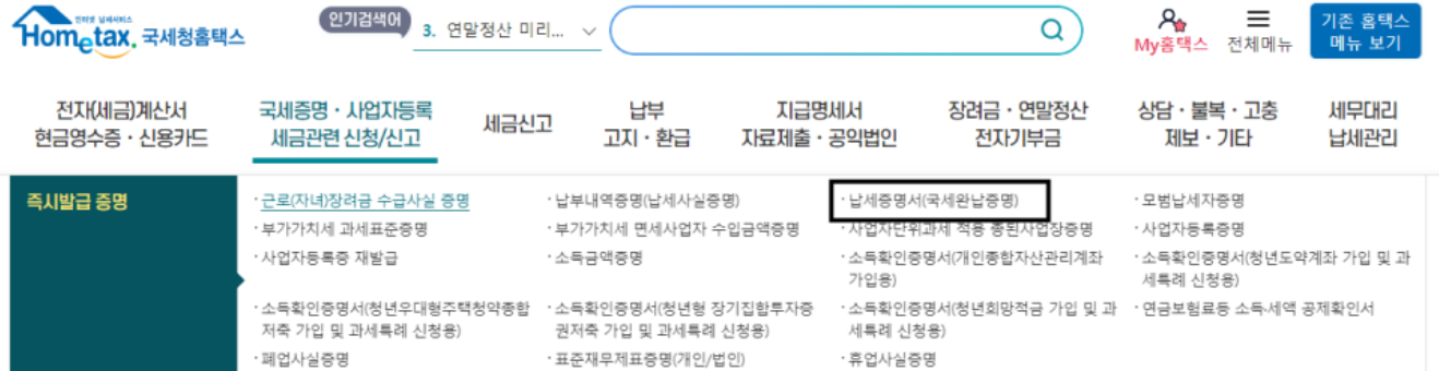 '납세증명서'를 클릭합니다.
